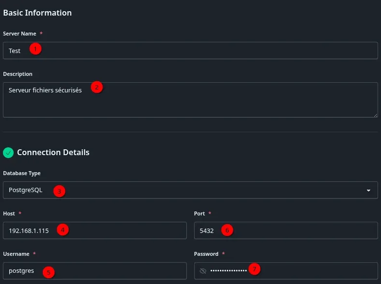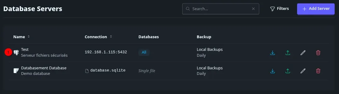 - 5 => Si vous voulez ajouter la propre base de Databasement en démo. Modifiable par après.
