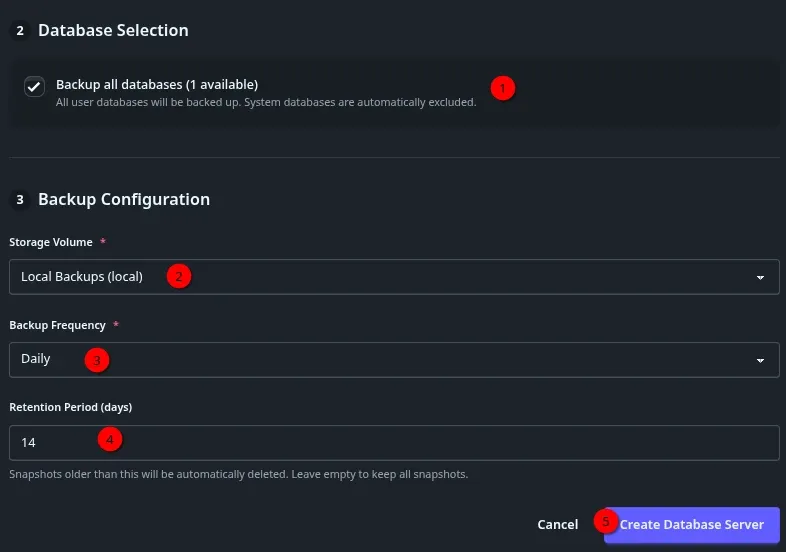 - 5 => Cliquez sur Create Database Server pour terminer.