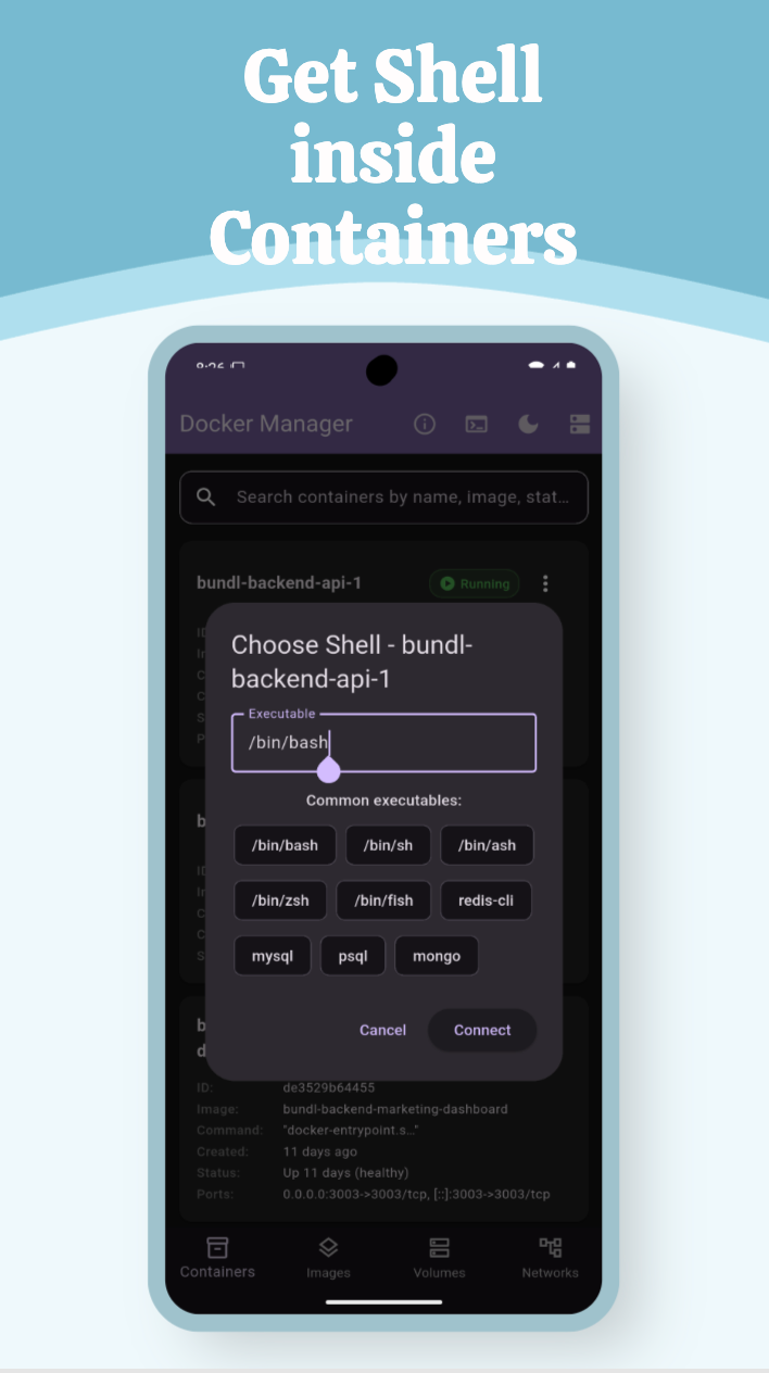 - Accès shell interactif : Obtenez un shell à l’intérieur des conteneurs ou sur le système hôte (bash, redis-cli, etc.).