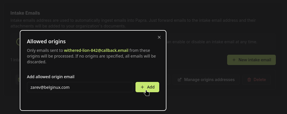 Cliquez sur Manage origins addresses afin d'ajouter les adresses mails à partir desquelles il sera admis d'envoyer des documents vers votre instance, tout autre adresse sera refusée. Cliquez sur + Add pour terminer :