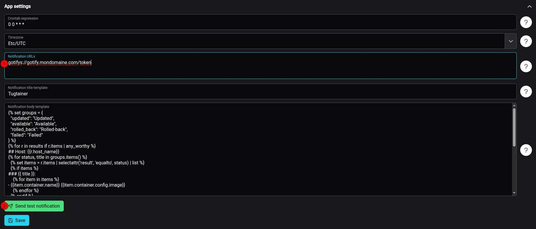 - 1 => Indiquez l'URL du service choisi, que ce soit Gotify ou une autre méthode.