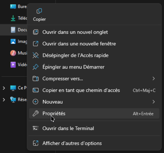 Dans mon explorateur de dossiers et fichiers, je vais cliquer droit sur le dossier Documents :